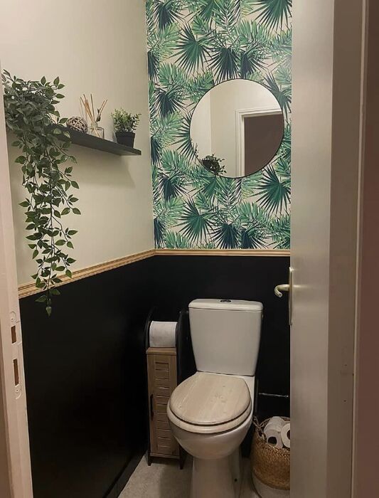 Grâce à un conjoint bricoleur, les travaux ont été finalisés en seulement cinq jours ! Ayant un budget limité, Laëtitia a cherché dans plusieurs magasins des décorations à petits prix pour agrémenter ce papier peint coup de cœur et créer une ambiance dans le thème tropical, qui lui tenait à cœur. Elle a utilisé une peinture velours noire, un papier peint, elle a ajouté une tablette murale et une moulure murale de finition. Avec quelques petits éléments en plus (une étagère, un miroir, des baguettes et un joli panier pour le rangement des rouleaux), elle a su créer des toilettes pleines de style ! Les quelques plantes disposées sur l’étagère créent un rappel végétal parfait pour sublimer le motif du papier peint. La transformation est facile, mais totale ! Et l’harmonie est parfaite dans ce petit espace. Même en conservant son WC au sol (ce dernier fonctionnait encore très bien), Laëtitia nous prouve qu’il est possible de transformer ses toilettes, sans tout changer, et à petit prix ! Depuis les travaux, elle reçoit de nombreux compliments de la part de ses proches et de ses invités.